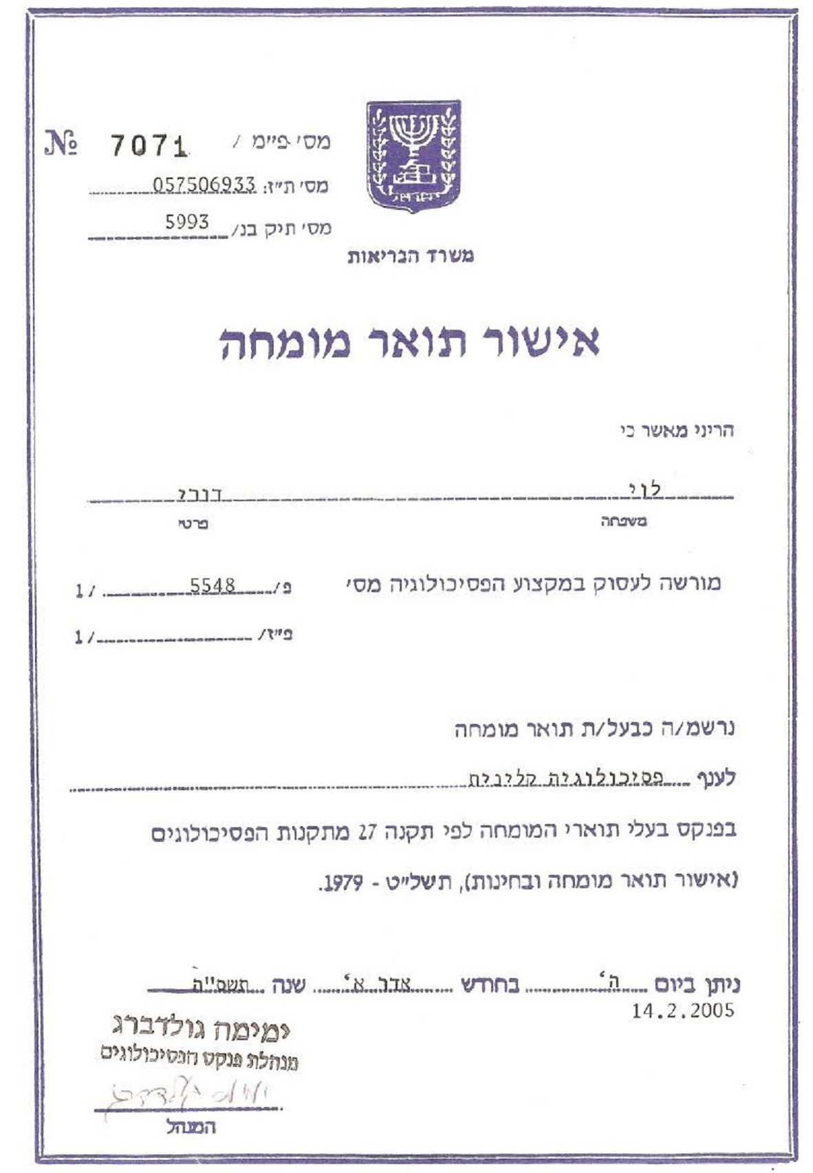צור קשר דורי לוי פסיכולוג קליני מומחה מטפל זוגי מוסמך לפרטים 054-4990201 תעודת פסיכולוג קליני מומחהממשרד הבריאות תעודת מומחה לטיפול ממוקד מטעם המרכז הידוע בעולם תעודת הסמכה כמטפל משפחתי מוסמך מטעם האגודה הישראלית לטיפול במשפחה ובנישואין